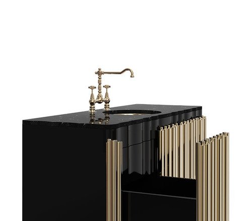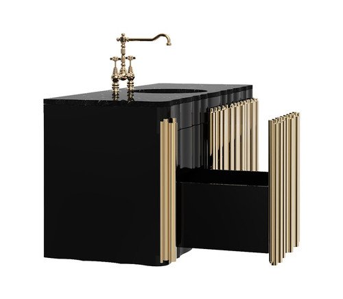 The Symphony Single II Suspension Cabinet draws inspiration from church organ tubes, as well as the curves of a violin. It features a cluster of polished brass tubes that envelopes an exotic wood structure and the countertop is all made of Nero Marquina Marble. This item is a true wonder to add to one’s bathroom interior design.